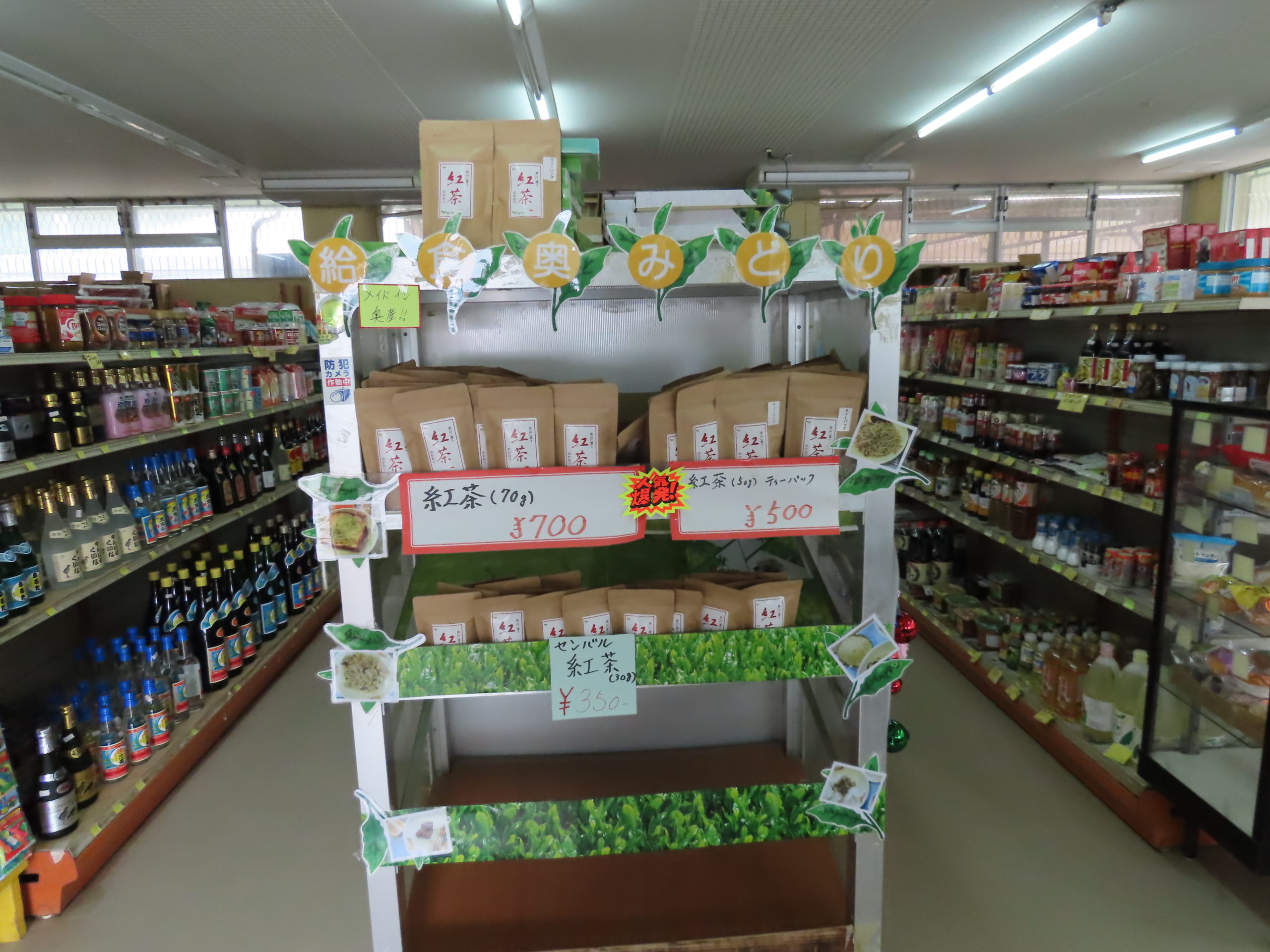 奥共同店の入り口が空くと奥産お茶がお出迎え